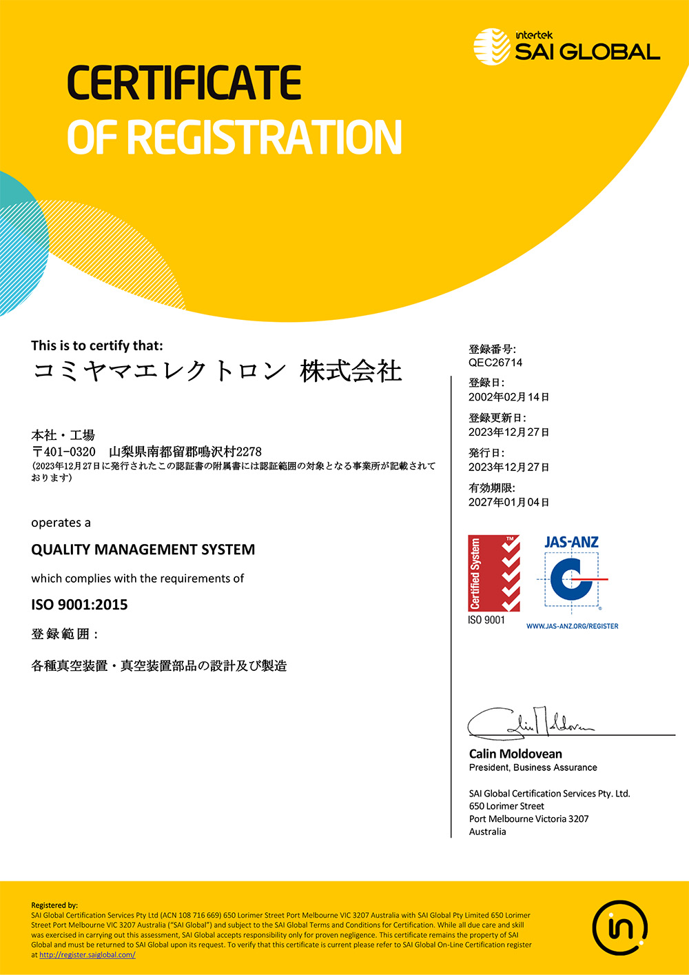 コミヤマエレクトロン株式会社は顧客に満足いただける製品とサービスを継続的に改善し、ものづくりの「品質文化」を向上させます。